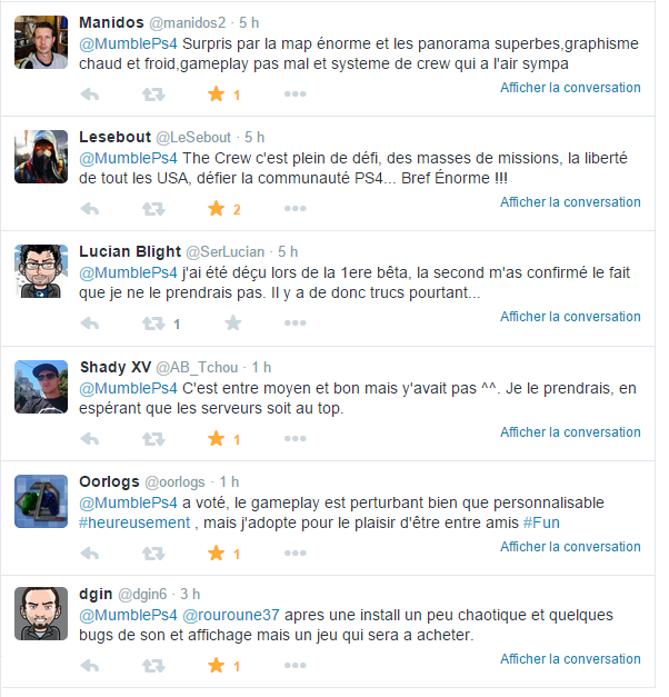 On ouvre le bal avec le jeu : The Crew . Ce week-end certains ont eu la chance de tester la bêta The Crew , je vous ai d’ailleurs fait gagner quelques clés , c’est maintenant l’heure du verdict des Twittos de @MumblePs4 .