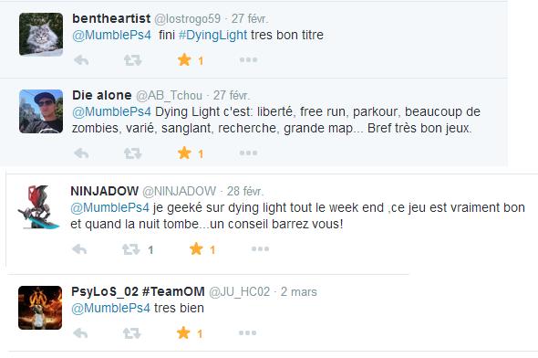4e avis des twittos de MumblePs4, ce coup-ci, c’est Dying Light qui est passé en sondage et le moins que l’on puisse dire, c’est que si vous aimez les zombies, ce jeu est fait pour vous ! Plus de 93 % ont aimé ce jeu !