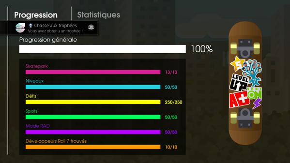 Bonjour et merci pour l’accueil. Non, je ne visais pas le platine au moment de commencer le jeu, car j’avais déjà joué au premier Olliolli sur Vita, mais je n’avais pas réussi le mode extrême, l’équivalent du mode RAD dans ce deuxième volet. C’est donc par curiosité que j’ai lancé le jeu quand il est sorti en profitant de l’offre du Playstation +.