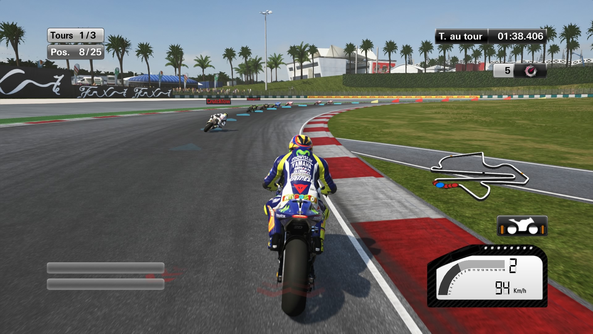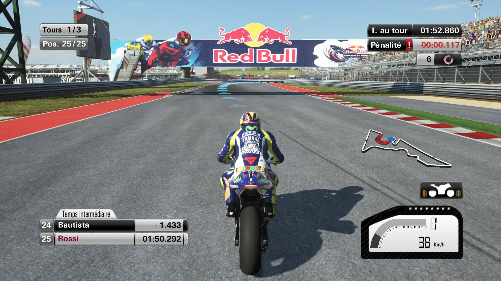 Comme pour les précédents opus, le gameplay est adaptatif. Si vous n’êtes un spécialiste de la moto vous pouvez activer toutes les aides disponibles. Dans cette configuration, vous n’éprouverez aucun problème à faire des courbes et de belles courses mais en même temps, on perd toute la saveur du titre. La configuration experte (sans aides) n’est pas évidente du tout sans que ce soit impossible. Personnellement, j’ai opté pour une configuration experte mais avec l’aide à la trajectoire et la motricité. J’ai vraiment du mal à doser l’accélérateur sans cette aide. En effet, sans cette aide si vous ne dosez pas la gâchette R2, c’est la chute assurée.