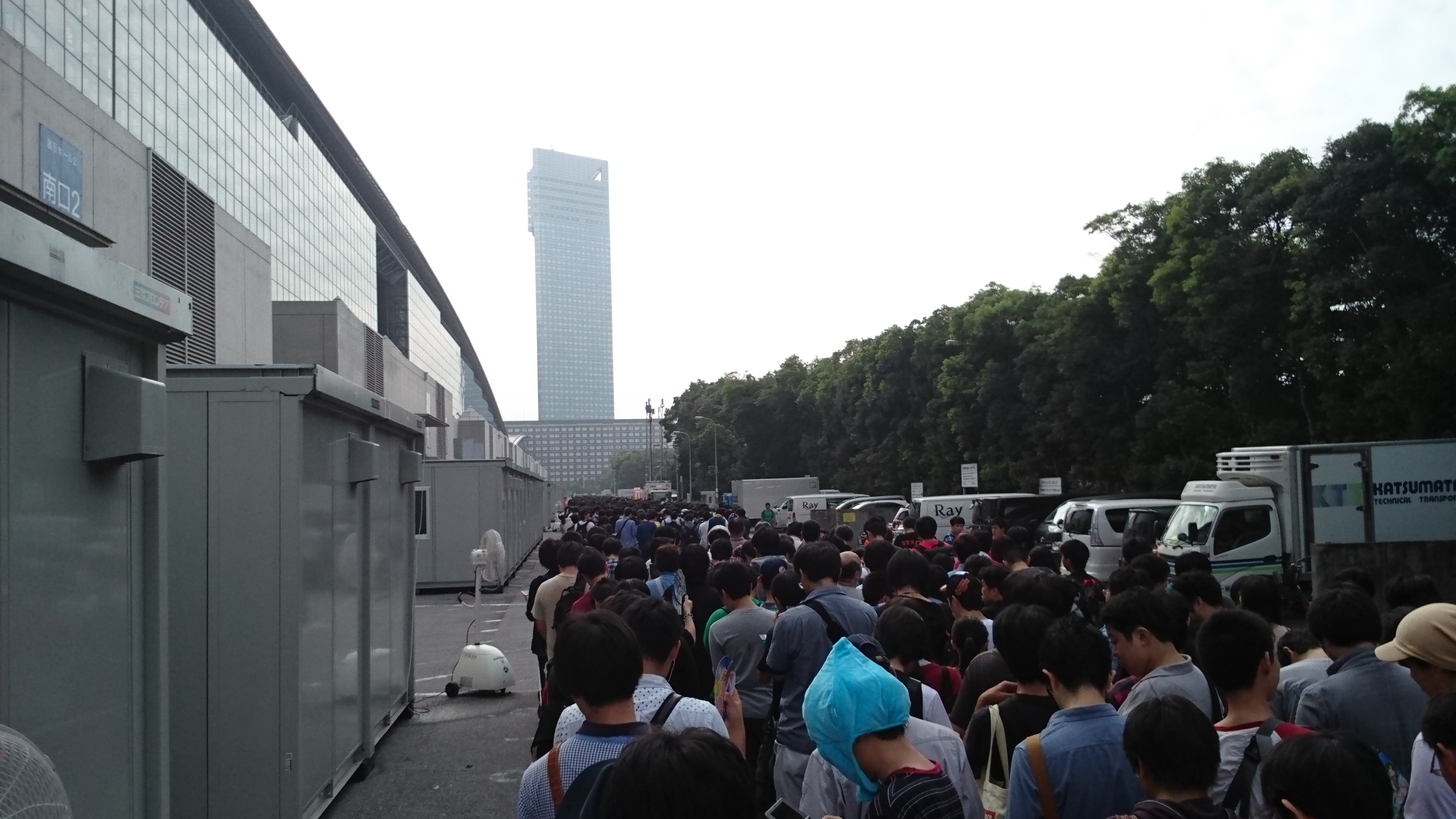 Il y a tout un détour à faire pour passer le contrôle sécurité (des policiers jettent un oeil dans votre sac et ils ne vous donnent pas envie de faire le malin). Vient ensuite le moment de donner votre ticket que j’avais acheté à Akihabara à mon arrivée (voir le jour 1 ;)). A partir de ce moment la file d’attente commence et il est 7h30 pour une ouverture des portes à 10h.