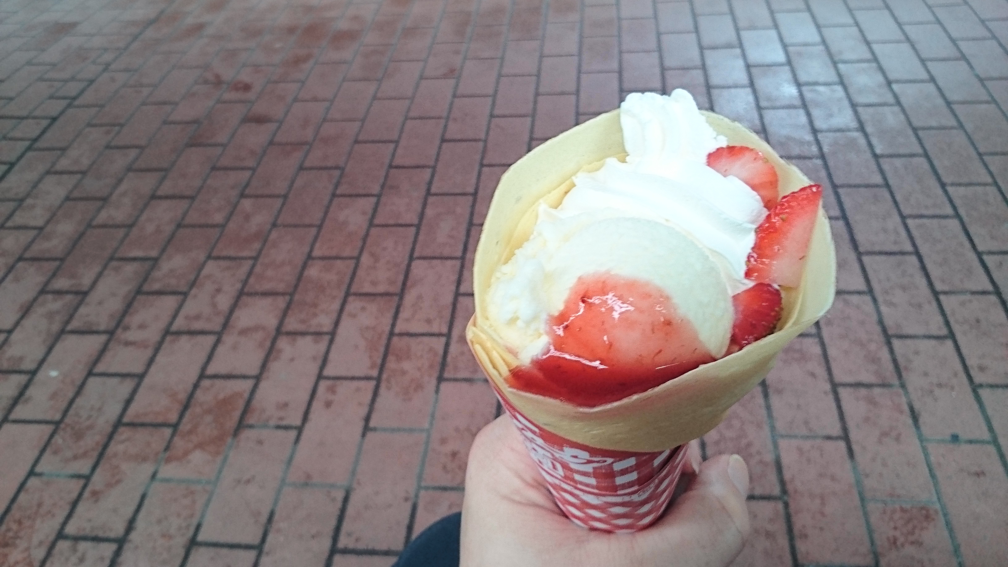 Il y a une sacrée variété de parfums et toutes ne me donnait pas envie notamment celle avec du porc O_o. J’ai choisi la numéro 20 celle avec de la chantilly, des fraises et une boule de glace vanille et un peu de coulis fraise pour faire passer le tout ^^.