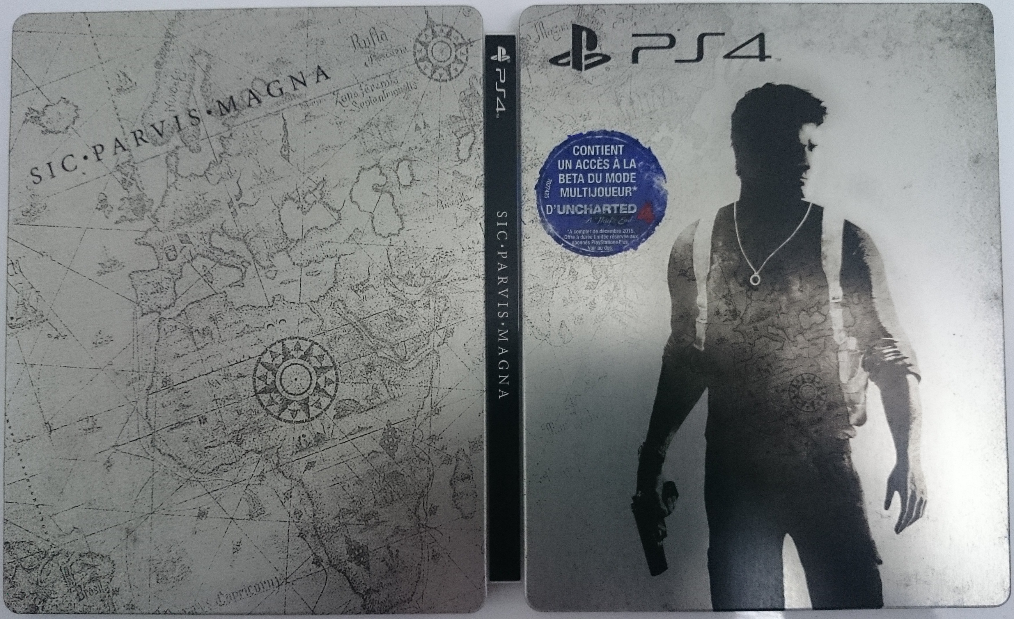 Le steelbook couleur argent brillant, superbe ! La pastille bleu s’enlève ;). Et regardez bien la tranche du steelbook, habituellement il y figure le nom du jeu et pas sur celui-ci. A la place il y a une inscription « SIC-PARVIS-MAGNA ». Je ne sais absolument pas à quoi cela fait référence ^^. Dites le moi en com’s si vous le savez.