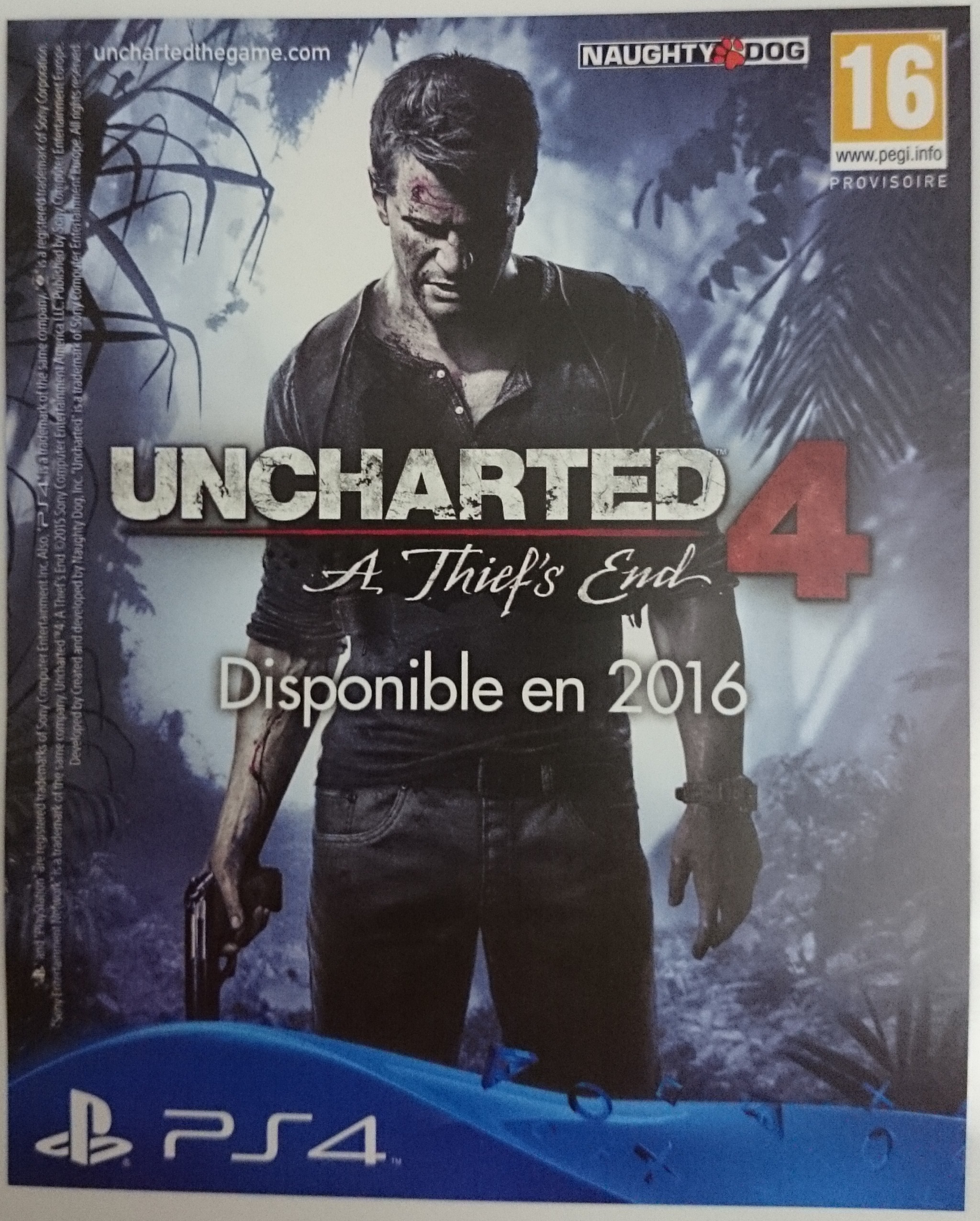 Juste pour finir, une petite pub flyer pour Uncharted 4, rien d’exceptionnel, mais comme vous pouvez le voir il n’y a pas la date exacte de la sortie de U4. Alors, soit la production de l’édition spéciale a été faite avant l’annonce de celle-ci (annonce faite le 31 août 2015), soit Sony n’est pas encore sûr que le jeu arrivera bien le 18 mars 2016.