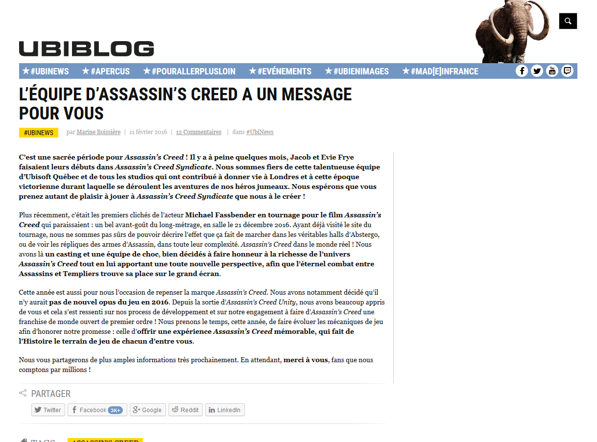 Pour résumer et lire entre le ligne, après les problèmes sur Assassin’s Creed Unity et après un Syndicate en demi teinte, Ubisoft décide de prendre une année sabbatique pour bosser un peu plus le prochain titre de la licence et offrir un divertissement plus abouti, frais et moins buggé!