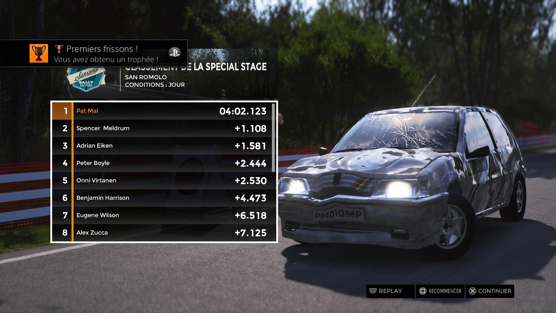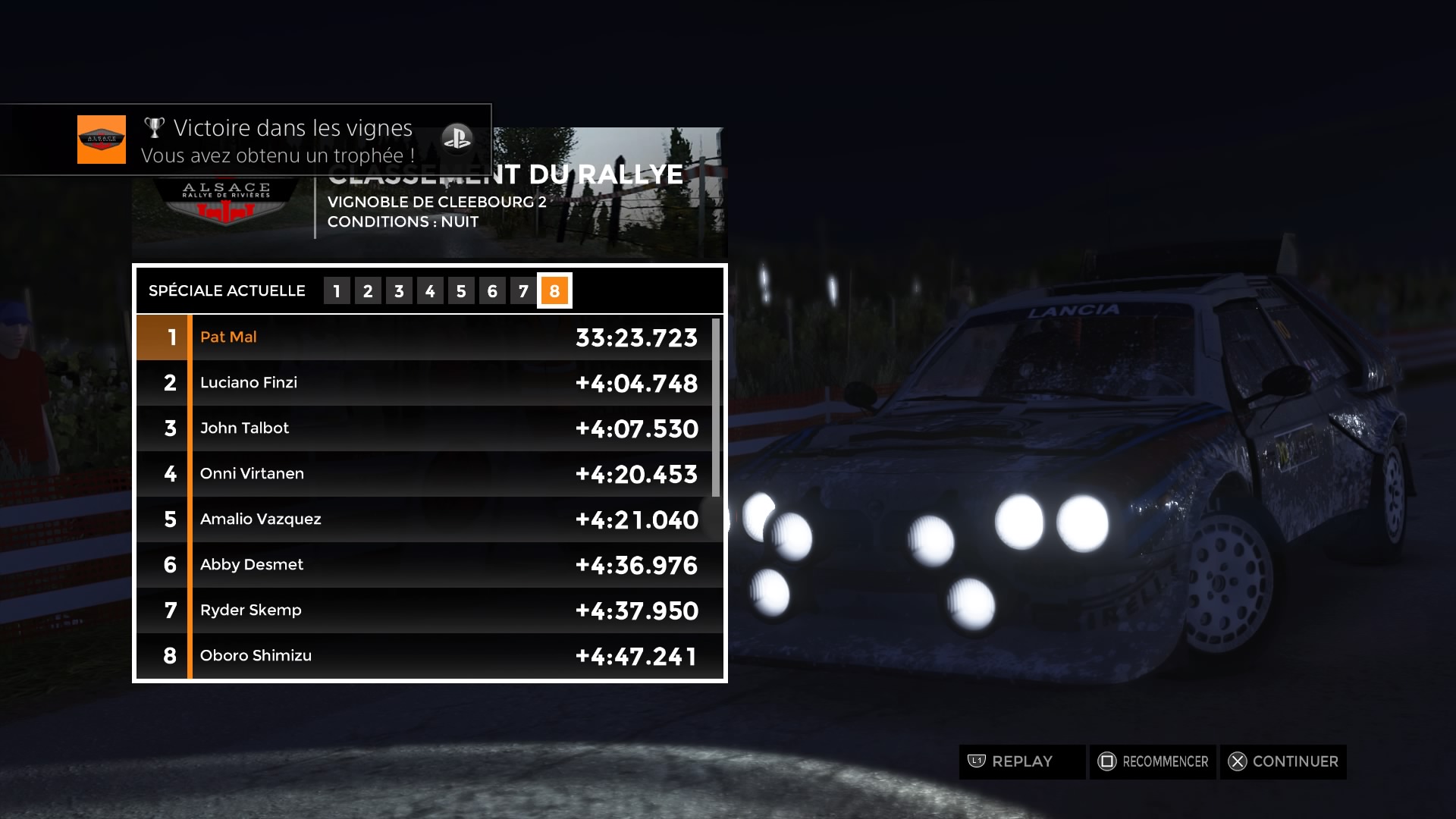 Ce trophée est faisable dans le mode carrière en allant dans la catégorie « Master » puis « Evo Rally Cars » et enfin dans « San Remo » rallye. En mode facile, il n’y a aucune difficulté puisque j’ai fini les 8 spéciales (dont 1 de nuit) avec plus de 2 minutes d’avance sans forcer. Choisissez la Volkswagen comme voiture.
