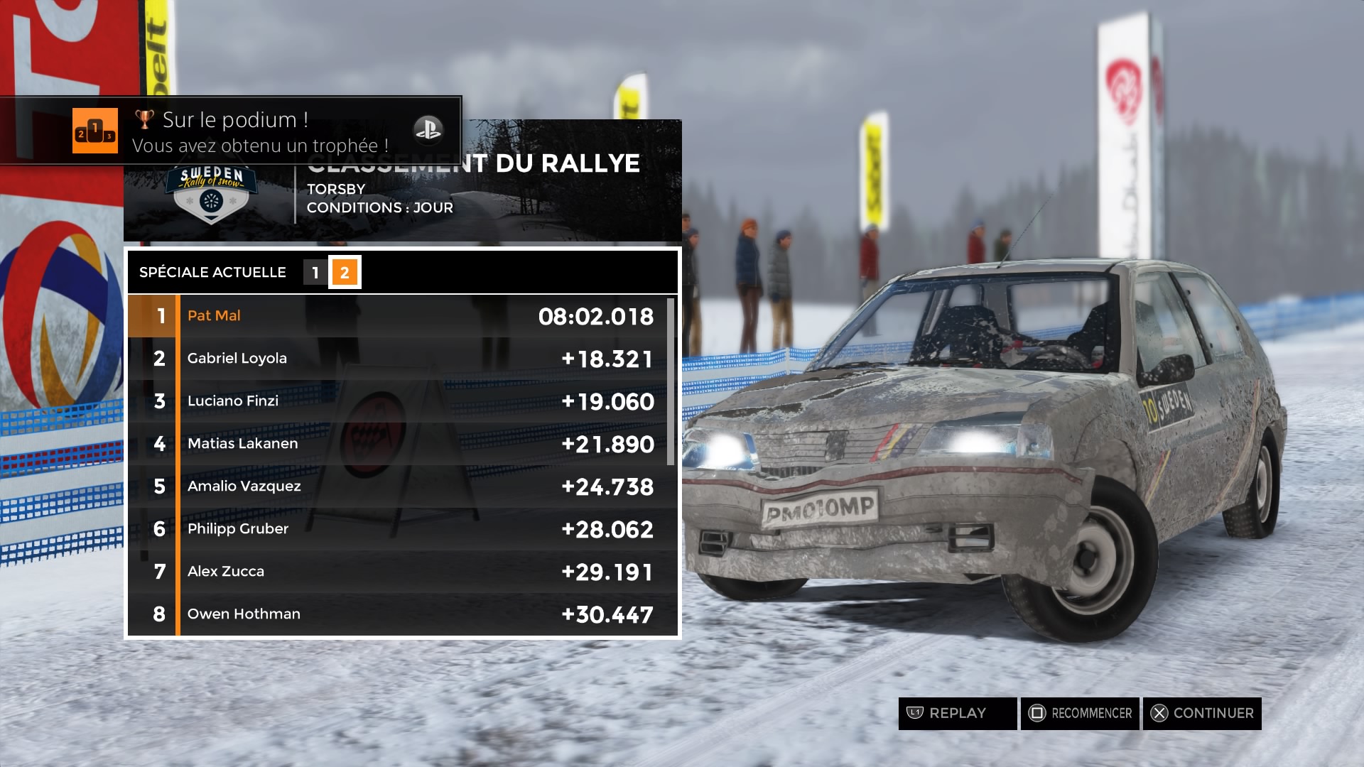 Tout d’abord, mettez vous en mode facile et la trajectoire activée. Ensuite en mode carrière allez dans « Debut » puis « Rookie » et enfin « Rallye suède ». Il s’agit d’un rallye en 2 étapes et donc plutôt facile à gagner