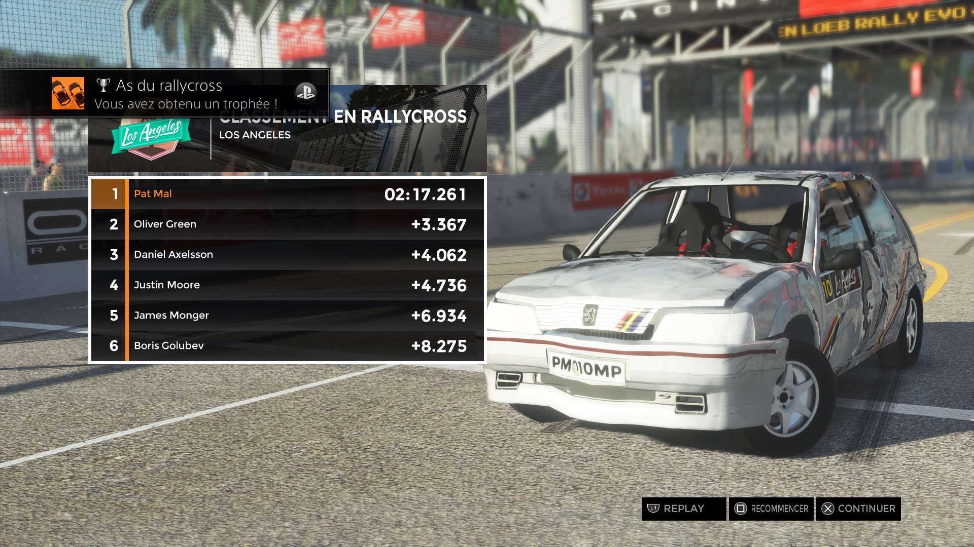 Personnellement, j’ai fait ce trophée dès le début en mode carrière avec l’IA en facile. Dans « Debut », « Rookie » et « Los Angeles », dès le premier effectuer le tour de pénalité comme ça, vous éviterez la cohue du dernier et vous gagnerez un peu de temps sur vos concurrents.