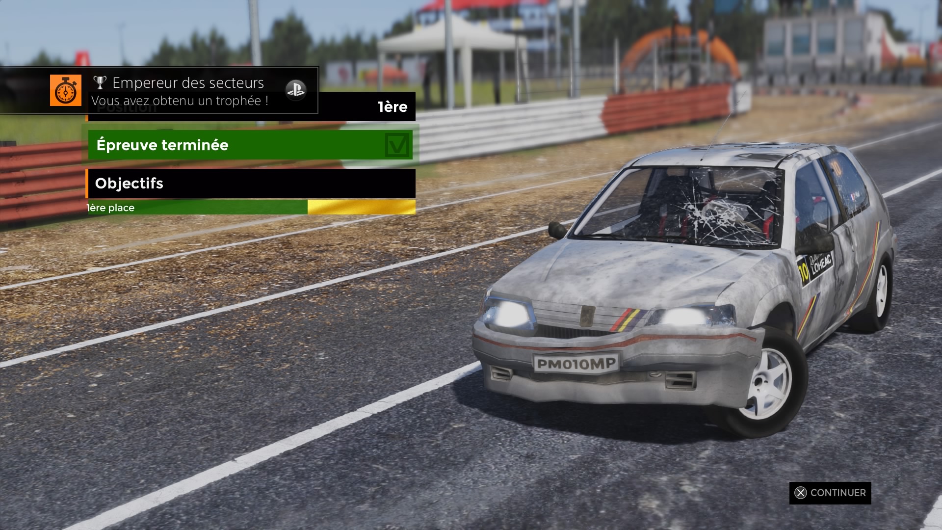A faire dès le début du mode carrière en allant dans « Debut » puis « Rookie » et enfin la dernière course à « Loheac ». Le plus simple est de prendre la tête dès le départ pour obtenir un maximum de secteurs puisque vous n’aurez pas de deuxième tour. Trophée extrêmement simple à obtenir