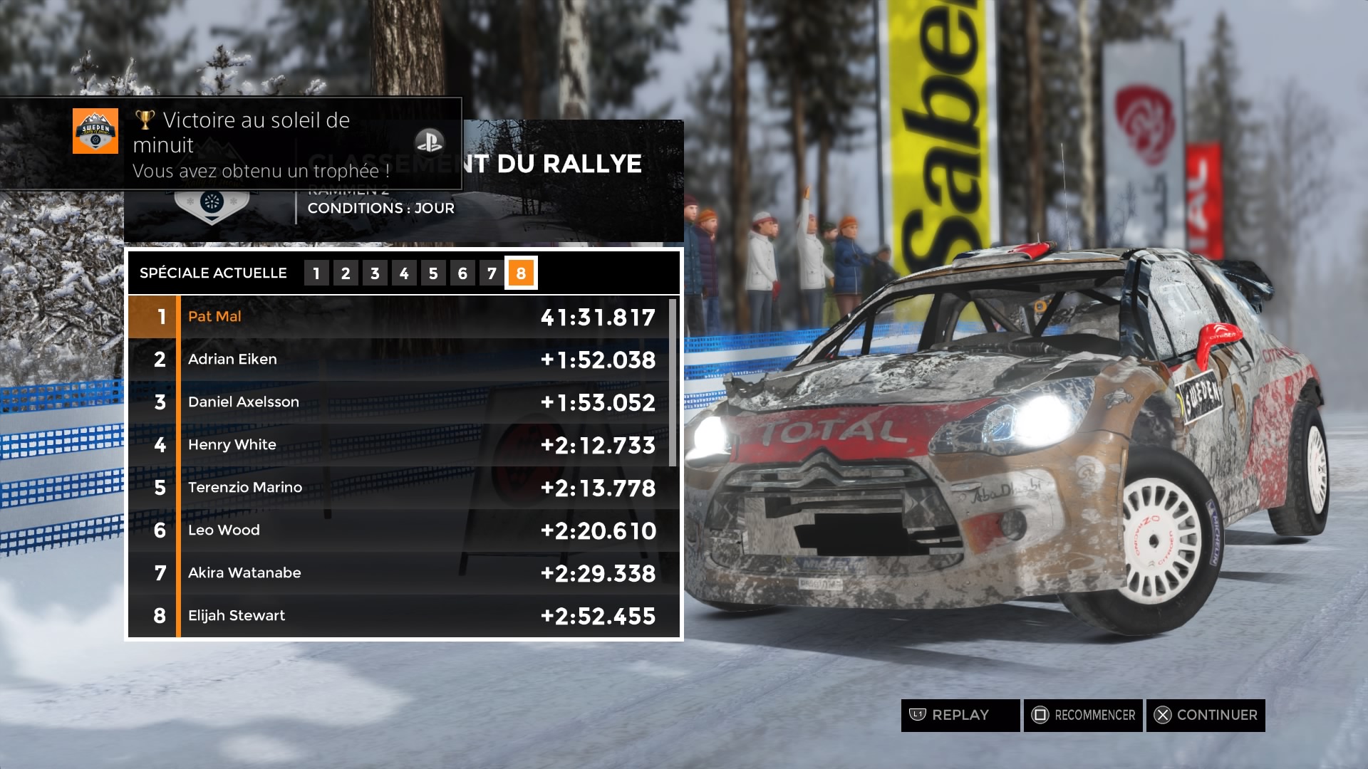 Ce trophée est faisable dans le mode carrière en allant dans la catégorie « Open » puis « Rallies around the world » et « Suède ». Il faudra acheter obligatoirement la DS3 rally car ’13. Vous ne rencontrerez pas de souci.