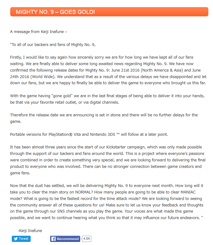 C’est Keiji Inafune qui nous l’annonce, le jeu sortira donc le 24 juin sur PS4, Xbox One, Wii U et PC.