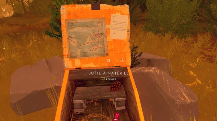 De plus vous devrez trouver des boîtes qui contiennent du matériel pour avancer dans l’aventure, ainsi qu’une mise a jour de la carte qui vous indiquera des points importants à visiter.