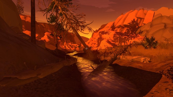 Firewatch propose un style graphique bien à lui. Les environnements rencontrés sont variés et relativement bien faits, entre le lac, la carrière, les grottes, les falaises voire même votre poste de surveillance, le tout accompagné d’un jeu et des variations de lumière vraiment bien fait. Vous vous surprendrez à explorer certaines zones en profondeur…