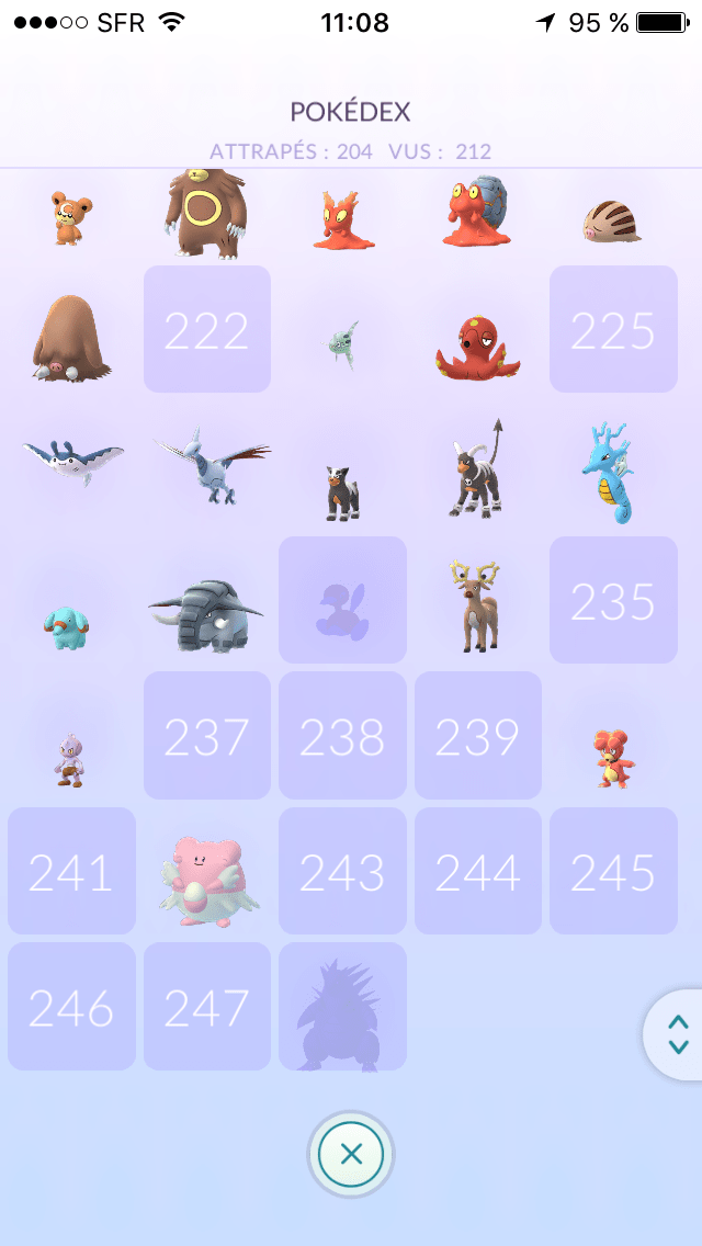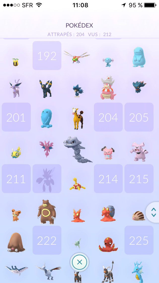Je vous avais laissé au mois de septembre avec 108 Pokémons dans le pokédex, pour vous faire un rapide bilan de la première génération, il me manque Ronflex et Lokhlass se sont les 2 seuls qui n’ont pas voulu de moi 😦 . Pourtant, j’en ai éclos des œufs (264), fait des kilomètres à les chercher (577 kms selon Pokémon go), bref, j’ai essayé mais en vain. Et puis l’hiver est arrivé j’ai fais les évents Halloween et un peu Noël mais la chasse devenait un peu mais palpitante.