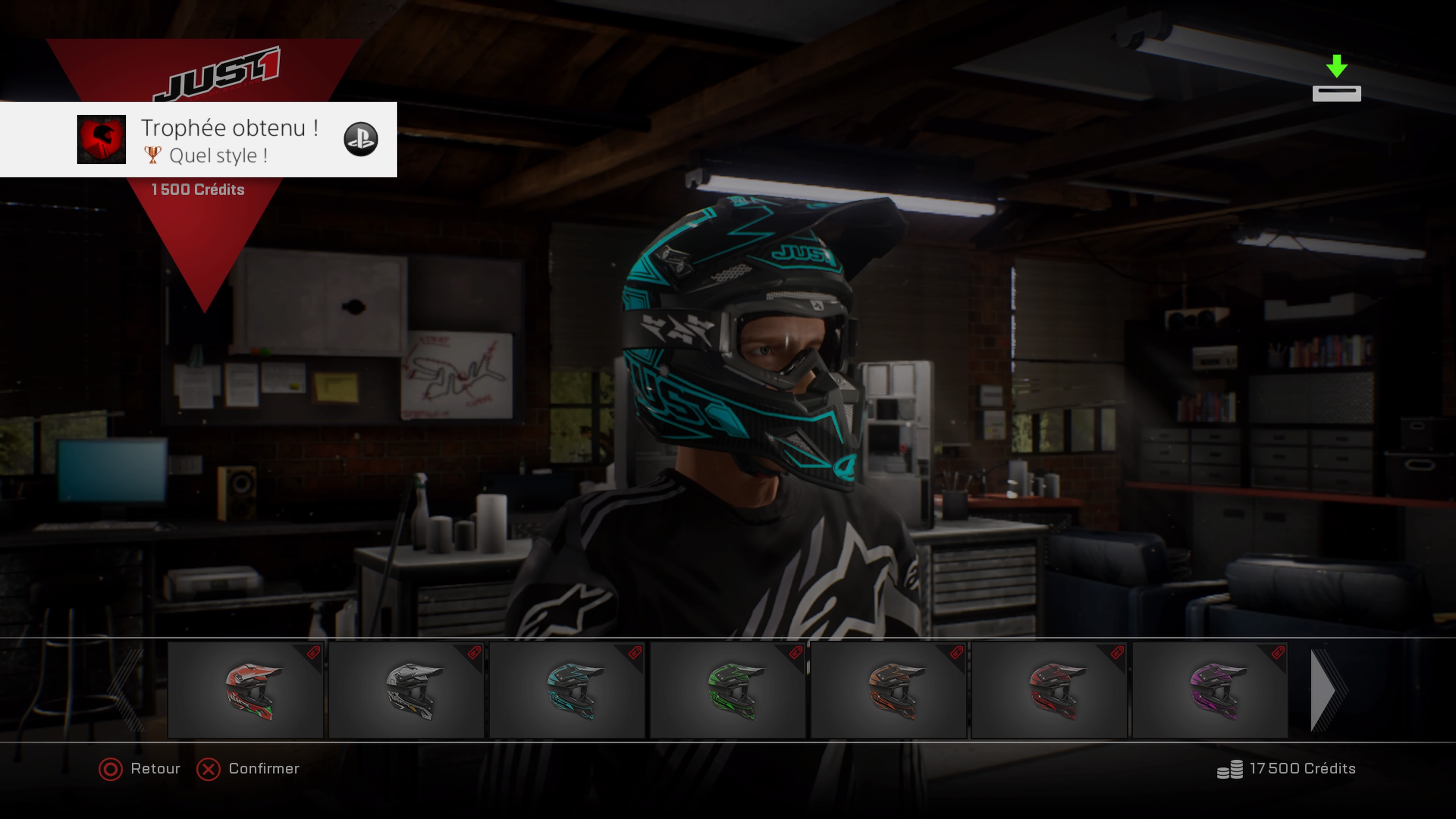 En mode carrière, dirigez vous sur le menu tenue du pilote. Choisissez un accessoire (un casque coûte 1500 crédits) et le trophée tombera tout seul