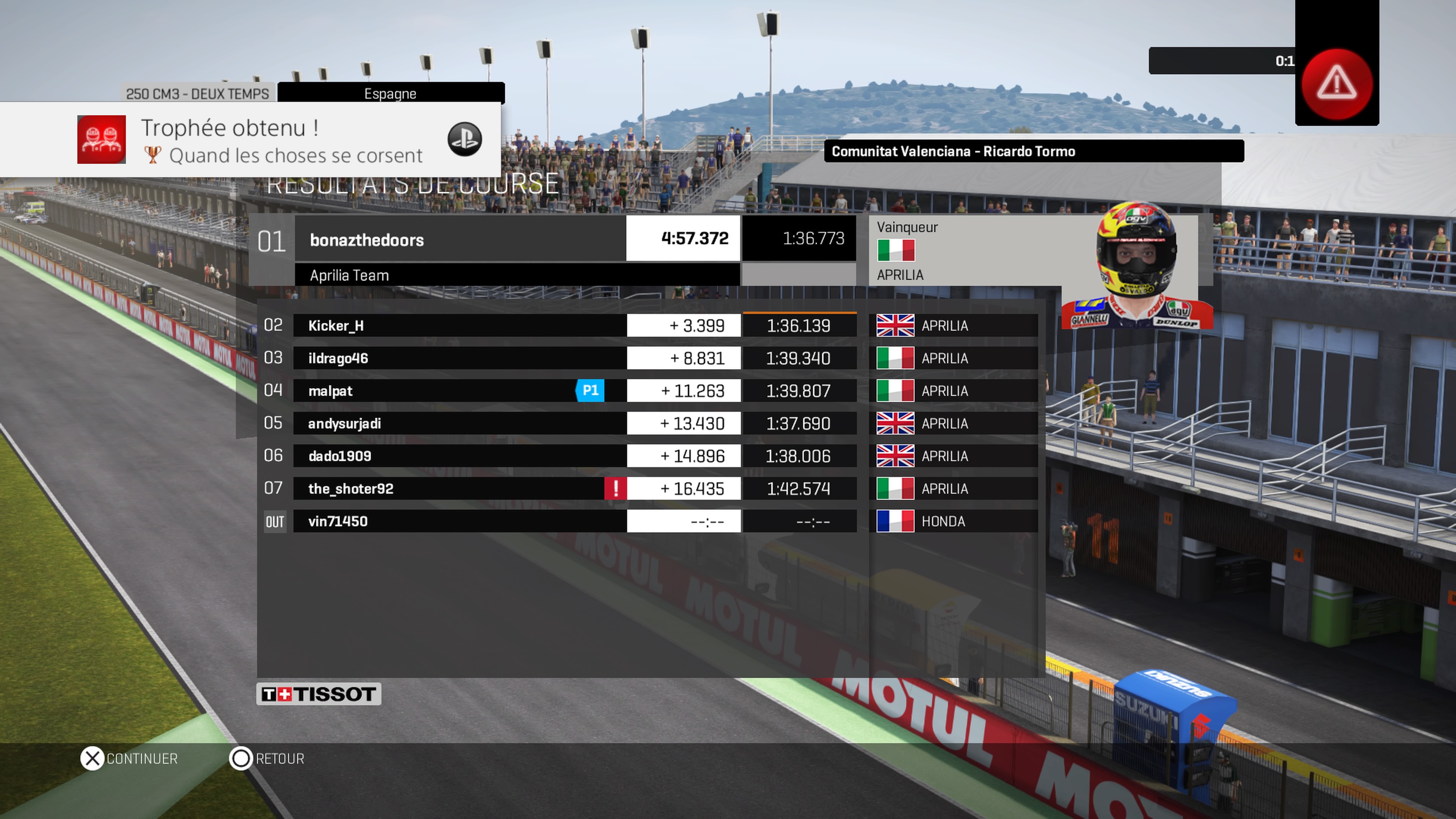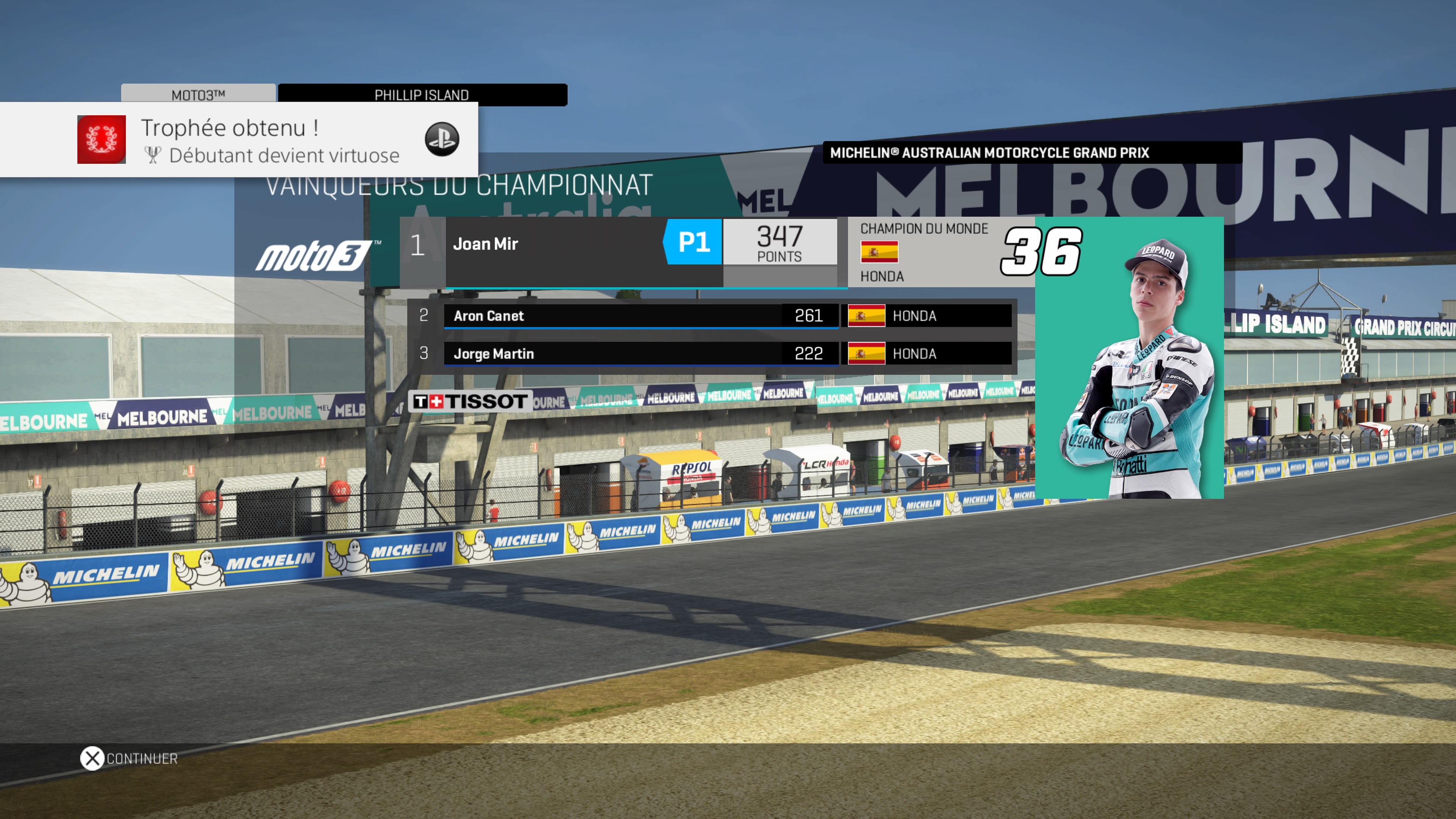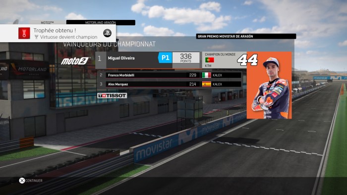 Comme pour le trophée précédent, le plus simple est de remporter le championnat Moto2 par vos propres moyens en mettant l’IA en mode très facile