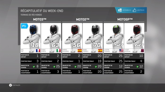 - Si tous se passe bien, vous effectuerez votre 3e saison en MotoGP. Cette catégorie est importante car elle rapporte énormément d’argent.. Achetez toujours la moto la moins chère. Améliorez votre MotoGP au maximum afin de réaliser le trophée correspondant tout en engrangeant de grosses sommes d’argent.