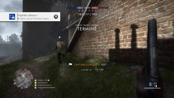 Alors d’habitude sur les FPS, j’ai plus l’habitude de commencer par le mode campagne, ça permet de prendre en main le jeu, mais sur ce BF1 j’ai vraiment navigué entre le multi avec les potes qui avaient le jeu et le mode campagne. Du coup, j’ai obtenu pas mal de trophées dans tous les sens ^^ :).