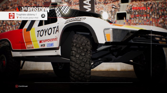 Le seul moment où je n’éprouvais pas vraiment de plaisir c’est lors des courses de pickups dans les stades où la conduite est très poussive, les bolides n’avancent pas et sont très lourds. J’avais parfois l’impression d’être au volant d’un tank. Comme ces courses ne sont pas nombreuses dans le mode carrière, j’ai réussi à passer outre cet écueil.