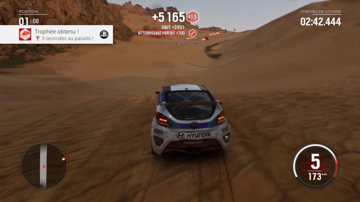 Quand au deuxième trophée cité, le problème réside dans un bug lié à la mise à jour du jour du jeu. Ce trophée n’est possible que sur une seule course et une catégorie de voiture. À partir de 180km/h, vous déclenchez la mention « vitesse élevée » mais elle se disparaît systématiquement dès que vous faites un saut et comme vous êtes sur descente de montagne, les sauts sont plutôt nombreux. Personnellement, j’ai réussi en ralentissant jusqu’à la limite (179km/h pour être précis) à chaque saut du coup la voiture ne sautait pas. L’inconvénient de cette méthode, c’est qu’il faut recommencer la course un certains nombre de fois pour quasiment le connaître par cœur.
