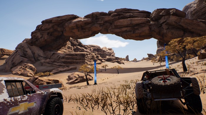 À ce sujet, l’idée d’intégrer ces courses où on est pas juste sur un tracé bordés d’arbres, de rochers etc… et d’avoir la possibilité de s’écarter un peu du tracé prévu est vraiment cool. Cela offre une belle sensation de liberté que l’on ne retrouve nulle part ailleurs. Malheureusement (et oui il y en a un), cette liberté n’est pas totale. Evidemment je conçois très bien le fait de ne pas être libre de faire un détour de plusieurs kilomètres mais parfois la typographie de la piste offre la possibilité de passer dans certains endroits mais lorsque vous tentez de passer à cet endroit, le jeu oblige à suivre un tracé prédéfinit.