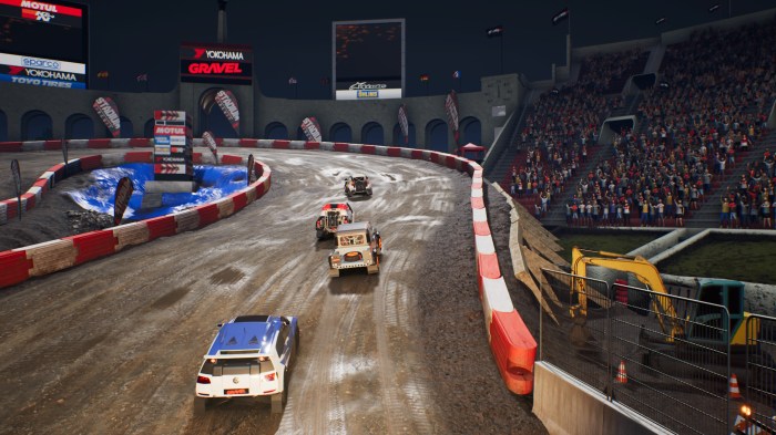 Passons aux courses que je qualifie (et franchement je n’exagère pas) de dégueulasses. Il s’agit des courses se déroulant dans les stadiums avec de gros pickups surboostés. Le premier reproche que je leur fais, c’est qu’il s’agit dans 90% des cas d’oval et dans les 10% restants des circuits en forme de 8. Les tours ne sont donc pas très passionnants et surtout très courts. Le second reproche que je leur fais c’est que c’est moche. La texture marron au sol représente une boue mouillée mais lorsque l’on roule dessus ne laisse aucune trace ni même de petites ornières (vu le poids et le nombre des véhicules, ce genre de choses devraient arrivées dès le deuxième tour). La modélisation du stadium est elle aussi d’un niveau abyssale surtout qu’un mois avant l’éditeur nous sort un Monster Energy Supercross ou les stades n’étaient pas géniaux d’un niveau largement au dessus de ce GRAVEL. Si je devais vous résumer, les décors sont très sombres (un cache misère) avec un public qui ressemble à une bouillie de pixels. Franchement ces circuits pourraient facilement tourner une PS Vita sans qu’elle soit poussée dans ses retranchements.