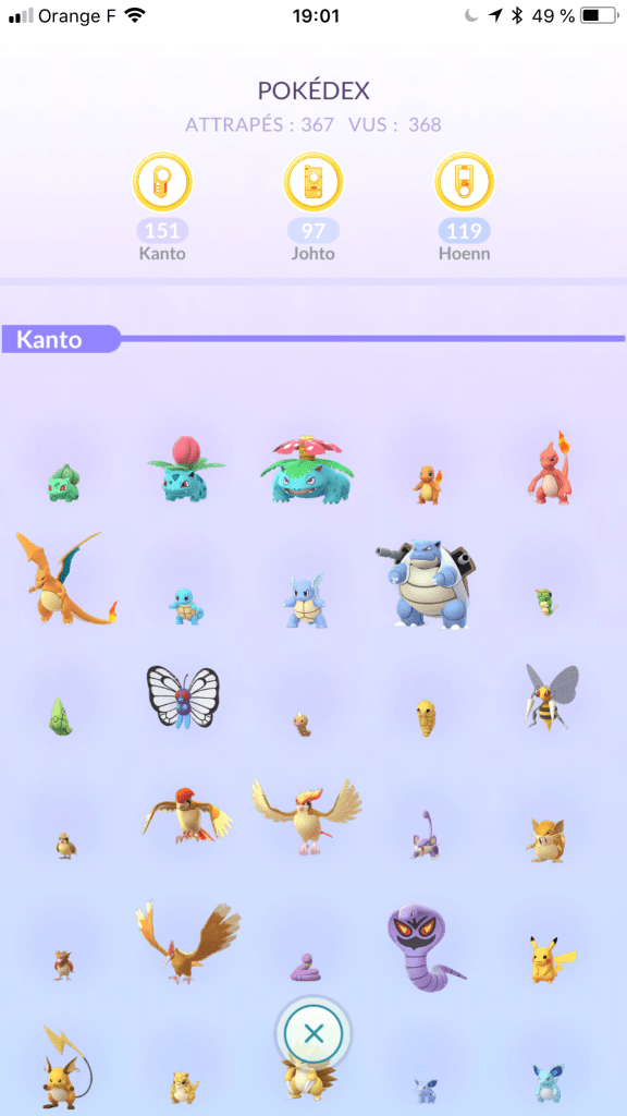 Pour ceux qui ont abandonné Polemon Go, il y a aujourd’hui 3 régions disponibles : Kanto, Johto et Hoenn et quelques pokémons de la région Alola. Je joue à Pokemon Go depuis le mois de juillet 2016 et quelques milliers de kilomètres au compteurs (4 478 pour être précis) et je viens d’avoir le dernier pokémon de la région de Kanto (soit 151 pokémons).