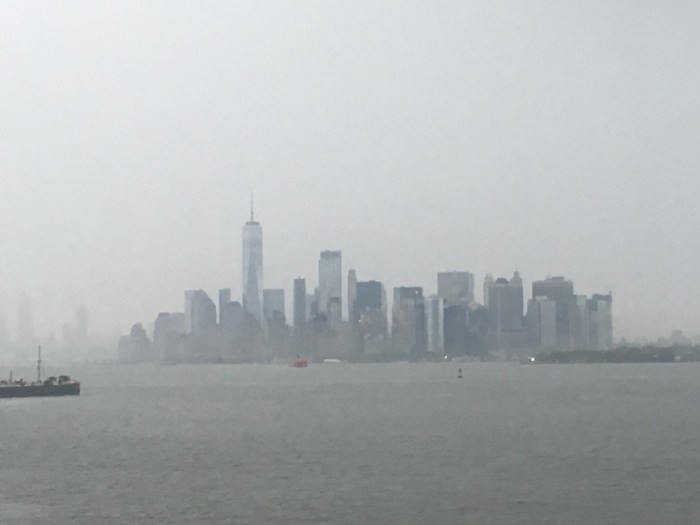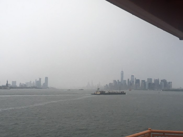 On fini par ce résigné car pas très envie de rester bloquer sur cette île, car il flotte des trombes d’eau. Retour au ferry, et quelle vue au retour sur New-York, dommage qu’il fasse moche.