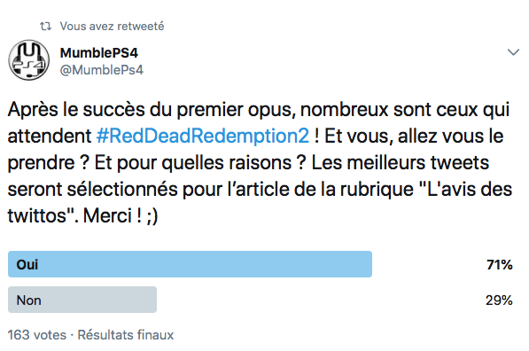 Salut les Twittos ! La semaine dernière, je vous ai posé une question concernant Red Dead Redemption 2, afin de savoir si vous comptiez vous l’acheter ou non. Après un premier épisode mythique, et plus que satisfaisant, nombreux sont ceux qui voulaient revoir l’univers du titre de Rockstar, sur consoles next-gen. C’est en voyant le succès de cette licence sur les réseaux sociaux que je me suis demandé à quel point vous attendiez cette préquelle. Grâce à vos votes, j’ai pu ainsi mesurer votre amour pour le far west en monde ouvert. Et malgré un résultat sans réelles surprises, j’ai tout de même pris un certain plaisir à lire vos diverses réponses…