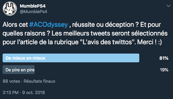 Suite à la récente sortie du nouvel Assassin’s Creed Odyssey, le 05 Octobre 2018, et vu le nombre de tweets le concernant, j’ai tenté, sans grand succès cette fois-ci, d’avoir vos avis sur l’un des titres phares d’Ubisoft. En effet, à travers mon dernier sondage, je souhaitais savoir si vous considériez ce nouvel épisode comme une réussite ou comme une déception. Et malgré le peu de réponses obtenues, j’ai tout de même pu en tirer des conclusions. Avant cela, je tenais à vous partager mon propre ressenti concernant ce jeu qui, selon moi, est une véritable réussite. Malgré de nombreux bugs et autres ralentissements, il faut l’avouer, la licence à su se renouveler et ce depuis le précédent opus, nommé Origins. D’ailleurs nous y reviendrons dans la conclusion, c’est pourquoi je vous donne rendez-vous plus bas, juste après les résultats du sondage :