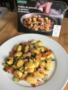 On a commencée par la poêlée de gnocchi au jambon et amandes, vraiment simple, les proportions sont bonnes, ça cale bien et ça a du goût ! Petites carottes, avec les amandes, c’est vraiment bon, première recette validée et faites en 20 minutes.