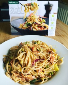 Spaghetti à la crème et au chorizo, miaaaaaam miam !! On s’est régalé, petit poireau, oignon rouge, de bonne saveur en bouche, en 15 minutes, c’est prêt. Un plat qui cale pour la journée. Et en plus il en reste un petit peu pour demain midi 🙂